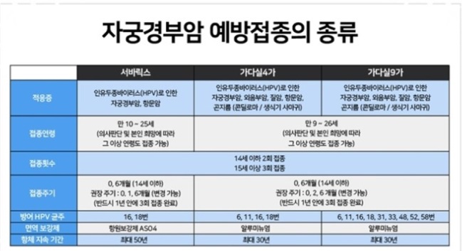 현재 우리나라에서 사용되고 있는 사람유두종바이러스 백신은 세가지 종류로 나뉘게 됩니다. 가다실 9가, 가다실4가, 서바릭스 2가가 있으며, 국가에방접종을 통해 지원되는 백신은 가다실 4가와 서바릭스 2가 두가지 입니다.